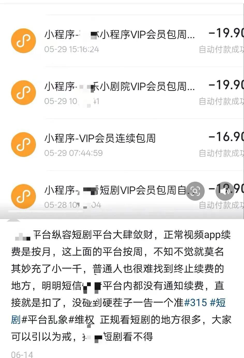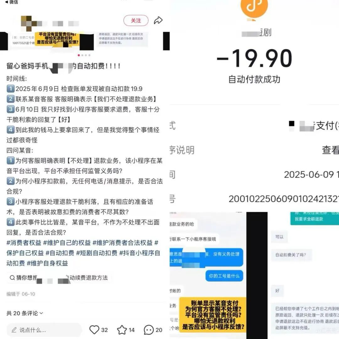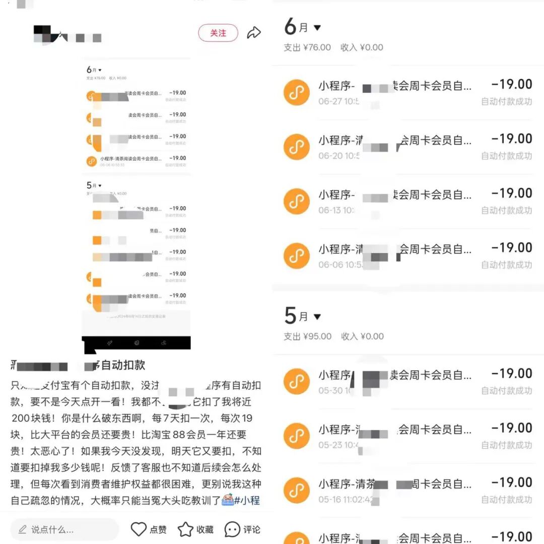 「只知道某宝有个自动扣款,没注意抖音小程序有自动扣款,要不是今天点开一看,我都不会发现它扣了我将近200块钱!你xxxx,每7天扣一次,每次19块,比大平台的会员还要贵!比x宝88会员一年还要贵!xxx如果我今天没发现,明天它又要扣,不知道要扣掉我多少钱呢!反馈了客服也不知道后续会怎么处理,但每次看到消费者维护权益都很困难,更别说我这种自己疏忽的情况,大概率只能当冤大头吃教训了。」