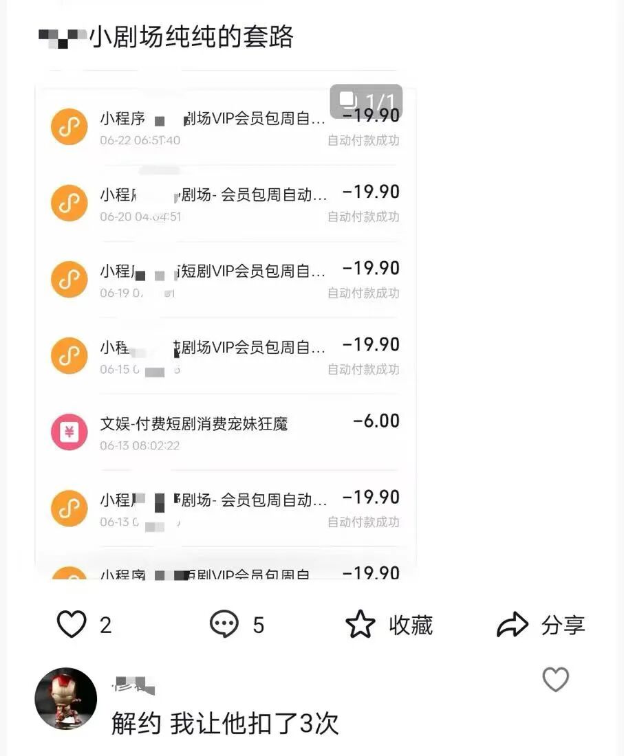 都知道漫剧席卷行业,但没想到,现在真人短剧付费市场也「不赖」,尤其是付费短剧。小红书上一名网友最近发帖称,自己父亲在抖音平台看剧,被开通了19个周扣付款小程序,每个月扣80块,一个月因为看短剧被扣一两千。网友称,以为是9.9买了一部短剧,但实际上是开通了会员,每周会扣款19.9元等。直到自己父亲说卡里没钱了,才引起本人注意,不看不知道,一看吓一跳,赶紧联系抖音客服退款,但有的时间久远,已无法退款。不过,即便如此,网友也替父亲从平台退回了近1.4万元,令人咋舌。新腕儿2025年7月曾系统报道过短剧周扣的小九九,大家可以点这里阅读。短剧付费市场日渐式微,刺激消费者付费的手段更是花样百出。最近,一些平台在刺激付费消费上,又搞出了点新花样,而且据说付费效果不错,但也引发了大量消费者的投诉。新腕儿研究后发现,有不少消费者在网络论坛反映「短剧会员包周自动扣费」的问题。据了解,有不少用户在观看短剧时,到了付费解锁部分,平台跳出「连续包周,一次回本」提示。正是看短剧还能「一次回本」的诱惑,让不少用户接连付费。在输入密码时,没什么人注意到屏幕下方边缘那六个不起眼的字——自动续费条款。直到次周的当天,付过钱,还等着「一次回本」的用户们,顿时傻眼了……短剧的周会员付费设置,正让短剧观众们陷入扣款争议。最近一段时间,小红书、主站、黑猫等平台上,陆续出现不少短剧小程序的扣费乱象相关的投诉。
