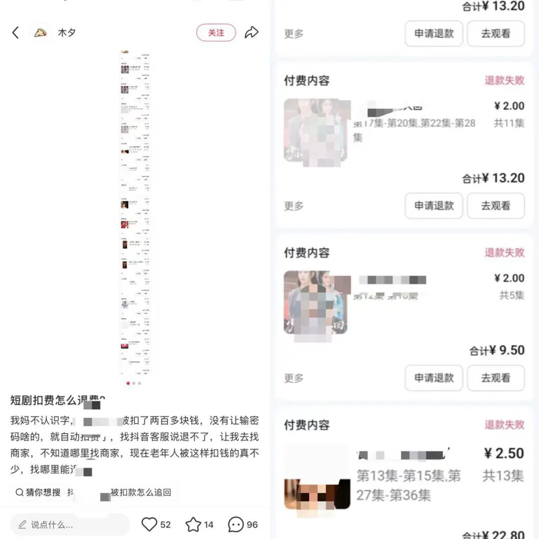 「我妈不认识字,抖音短剧被扣了两百多块钱,没有让输密码啥的,就自动扣费了,找客服说退不了,让我去找商家,不知道哪里找商家,现在老年人被这样扣钱的真不少,哪里能退啊。」