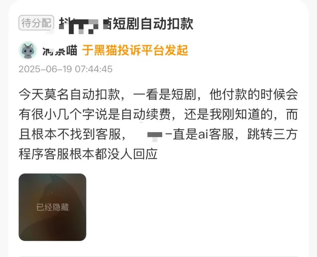 「今天莫名自动扣款,一看是短剧,他付款的时候会有很小几个字说是自动续费,还是我刚知道的,而且根本找不到客服,主站一直是AI客服,跳转到三方程序客服根本都没人回应。」