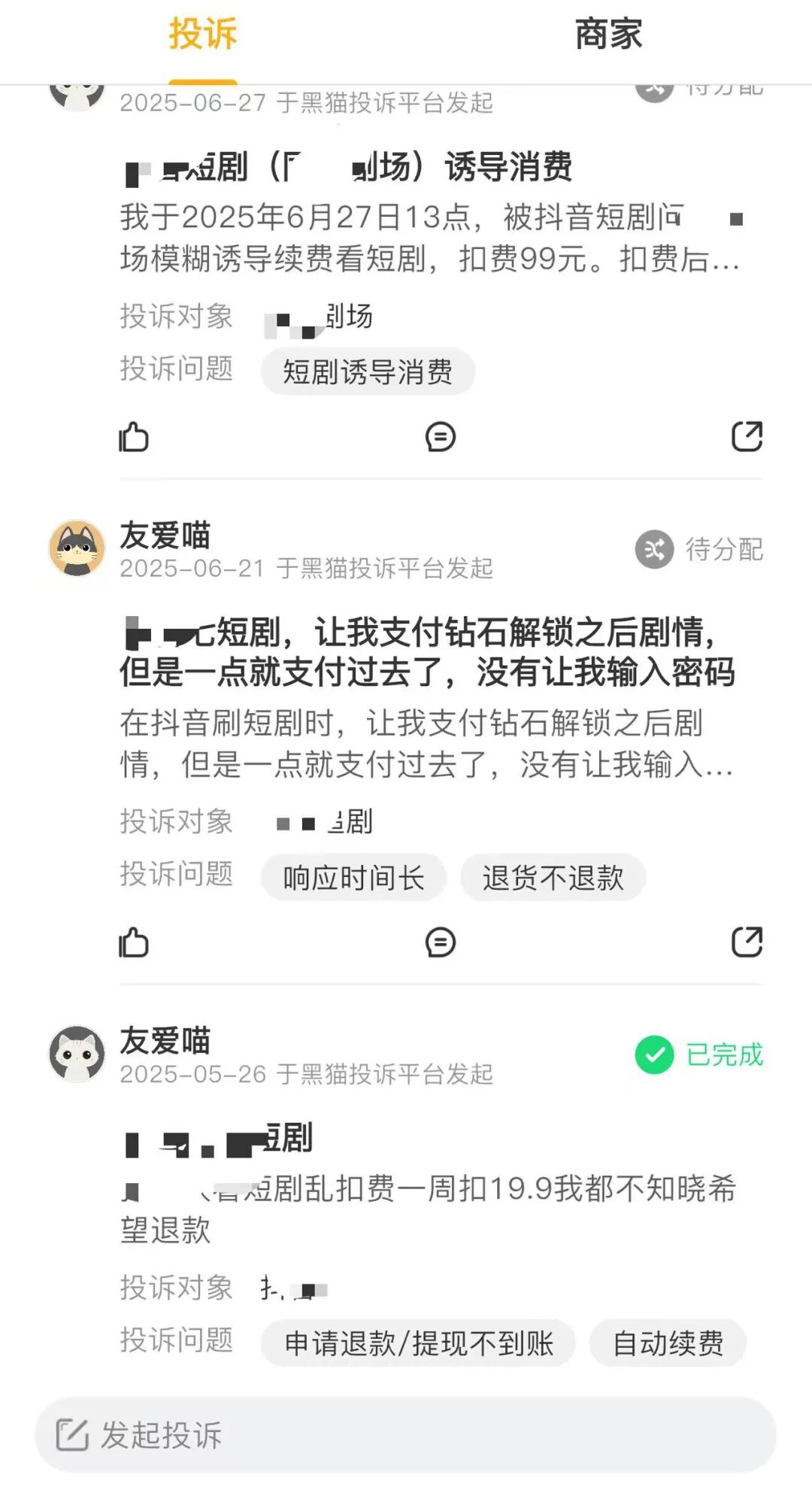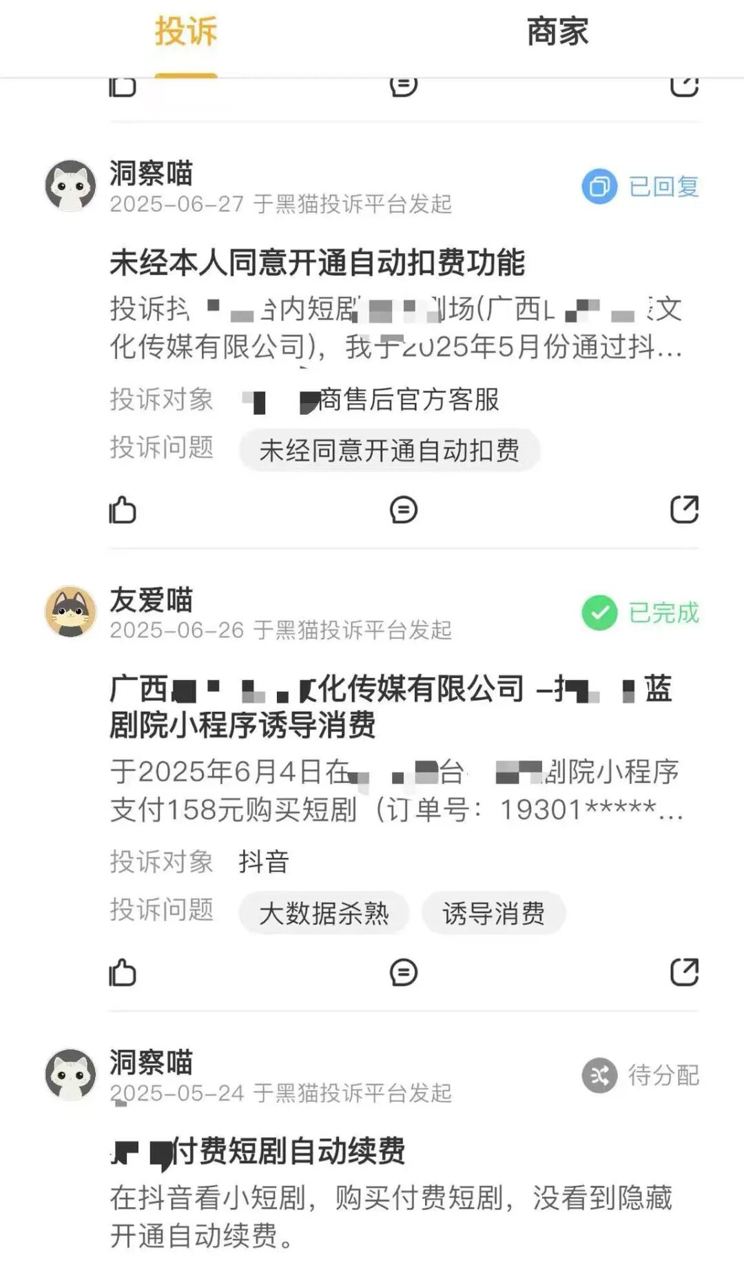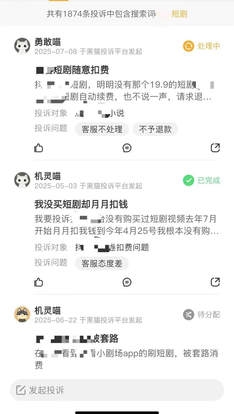 黑猫投诉上,关于短剧的投诉信息,90%以上与会员自动续费有关。消费者们看短剧正上头,充值周会员后,未曾想,竟开启了自动续费服务。