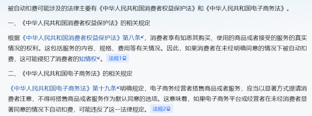 「根据根据《中华人民共和国消费者权益保护法》第八条,消费者享有知悉其购买、使用的商品或者接受的服务的真实情况的权利。这包括服务的内容、规格、费用等有关情况。因此,如果消费者在未经明确同意的情况下被自动扣费,这可能侵犯了消费者的知情权。」