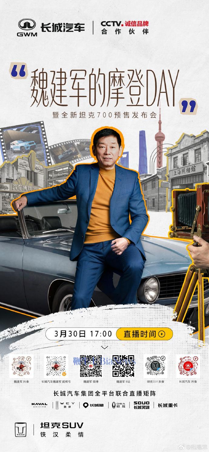 长城全新坦克700明日开启预售,魏建军将直播体验「摩登生活」