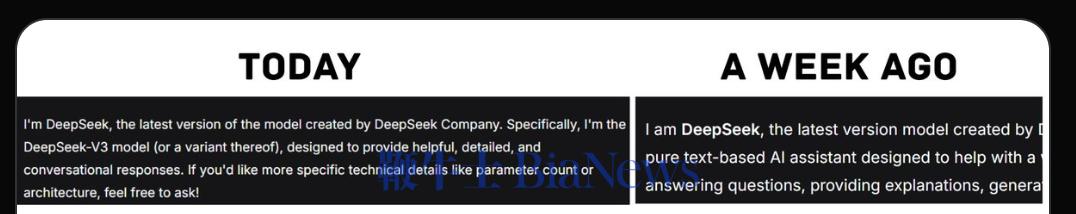 一周前,同样的问题,它的自我介绍还是模糊的“我是DeepSeek,一款纯文字AI助手……“,对自己的版本号只字不提。