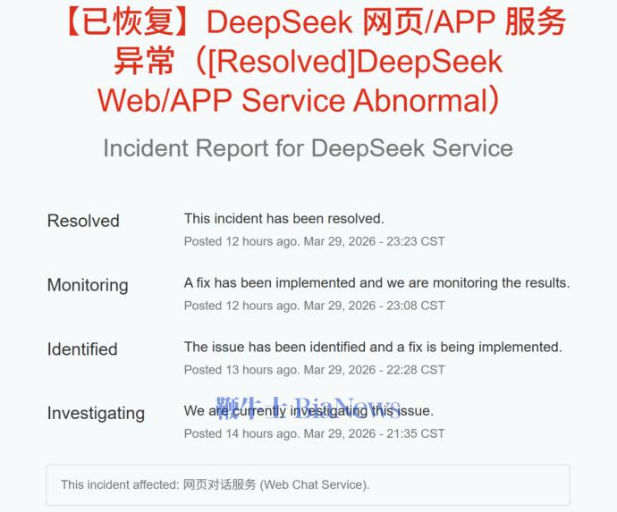 我们先来回顾一下这次事故吧,3月29日晚到3月30日上午,DeepSeek出现了一次持续10多个小时的异常。