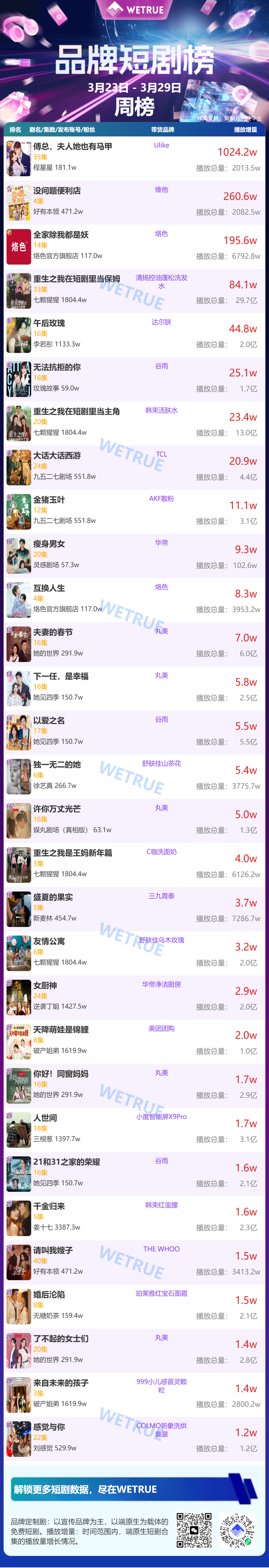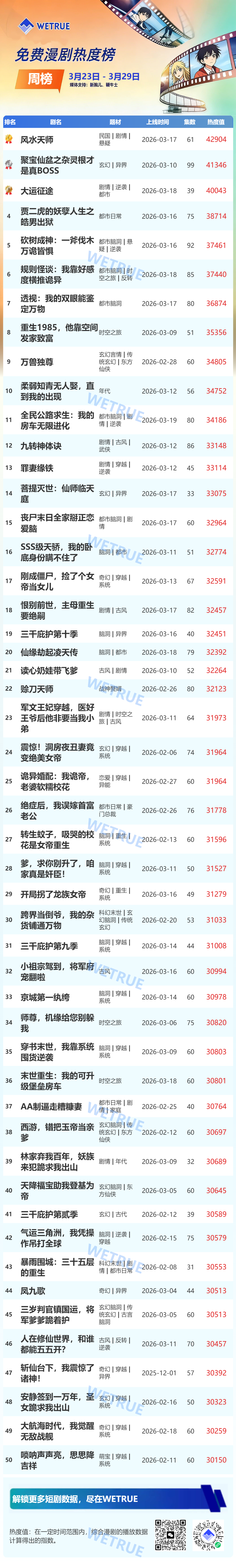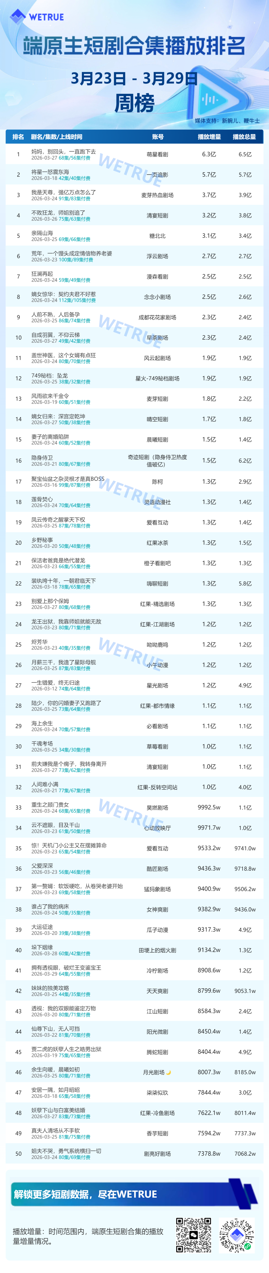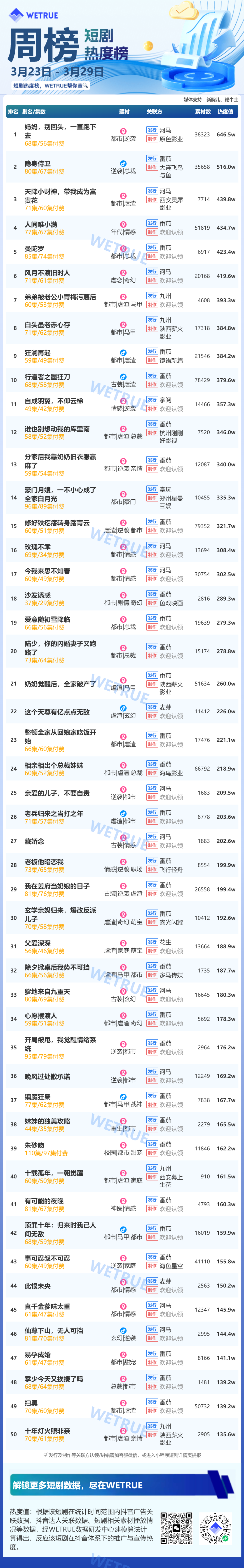 3月30日消息,新腕儿、鞭牛士联合WETRUE数据共同推出3月第4周的真人短剧(付费、免费和端原生)&漫剧周榜、免费漫剧热度榜。