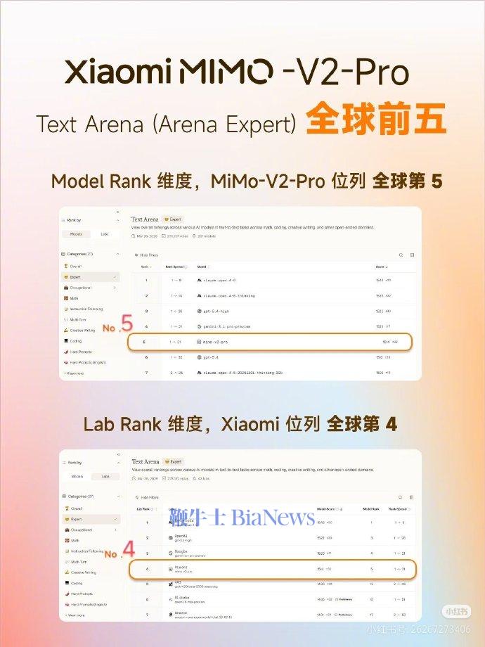 3月31日,小米创办人,董事长兼CEO雷军发文表示,MiMo-V2-Pro大模型在Model Rank维度,排在全球第五。