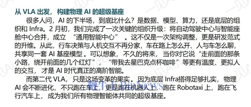 小鹏汽车2026年开工信 今年2月21日,特斯拉CEO马斯克(Elon Musk)也曾在X(原推特)上表示,特斯拉“语音控车”的能力就快来了。 魏斌曾任高德地图产品总监,负责导航与地图产品规划。2021年底加入小鹏集团之后,魏斌主要担任互联网中心负责人,主导智能座舱的研发与落地。 在五年的工作经历中,魏斌推动了小鹏智能座舱的平台化,2024年小鹏发布的天玑XOS 5.0,是魏斌团队成功解决小鹏智能座舱的基础问题、拉通平台化后,开始创新的第一个版本。除此之外,魏斌团队还开发了小鹏与华为合作、首先搭载在小鹏G7上的AR-HUD(「追光全景」抬头显示),以及推出了行业内首个免唤醒的智能语音功能。 一位接近魏斌的知情人士评价,魏斌工作“极其严苛和自律,执行力超强”,能够“连续几个月,每天工作十多个小时”。 去年6月,魏斌接受媒体采访时,曾预判在智能座舱搭载VLM大模型、拥有车身所有的传感器数据,并与自动驾驶中心共建车外情景的图像感知之后,小鹏汽车将会拥有“座舱大脑”,能深度理解用户需求,对用户的潜在需求进行“主动服务”。比如在迎宾环节,乘客在上车的第一刻,小鹏汽车就能够自动帮你调整空调、座椅,甚至播放上次听的歌和今天的头条新闻,并且能根据实时路况主动为用户选择导航线路。 魏斌当时表示,智能座舱曾在很长一段时间内只能小修小补,但如今基于VLM大模型会发生大的创新。 魏斌的预判都已经在今年年初得到了初步实现。今年1月8日的小鹏全球新品发布会上,小鹏发布天玑AIOS 6.0智能座舱系统,宣布其基于VLM大模型的赋能,能通过用户行为学习,主动提供导航规划、空调调节、座椅姿态调整等个性化服务。 智能座舱功能继续大幅提升,除了因为VLM大模型上车以外,还得益于舱驾融合。曾经的“舱驾一体”是在硬件层面,指用一颗芯片干完智能座舱与自动驾驶的所有活儿,但如今的舱驾一体已经进化到数据与模型层面。2025年7月12日,特斯拉最早将多模态大模型Grok融入FSD(完全无人驾驶)系统。随后小鹏迅速跟进,今年2月3日,小鹏集团的自动驾驶、智能座舱中心合并,新成立通用智能中心。 模型层的舱驾融合,能够同时提升智能座舱与自动驾驶的能力。对座舱侧来说,拥有更多智驾侧的环境感知、驾驶行为、场景决策数据之后,感知能力将大幅提升,相当于拥有了人类的“五官”,有潜力成为一个更懂用户的情感化、拟人化助手。 而对智驾侧来说,则拥有了更多座舱侧的人机交互、用户行为数据。一位自动驾驶从业者向《21汽车·一见Auto》表示,多模态大模型经过互联网上海量的文本、图片和视频等数据训练,与自动驾驶大模型融合后,相当于为其安装了“通用大脑”,让其具备了对世界的通识与人类的价值观,并提升其推理能力,解决更多驾驶中的Corner case(长尾场景)。这也是为什么加入Grok后,FSD V14.2的驾驶水平得到了大幅提升,被很多国外媒体评价为“丝滑”且具有“人类感”。 但除小鹏以外,国内其他车企也已经迅速跟进舱驾融合:今年1月28日,理想汽车将自动驾驶团队并入软件本体团队,由勾晓菲统筹智能座舱与自动驾驶研发;3月17日,吉利汽车宣布舱驾融合实现突破,其携手千里科技、阶跃星辰,对标特斯拉的Grok与FSD打造了“超级Eva + G-ASD 4.0”,并称二者会实现技术合流。 虽然都做舱驾融合,但车企对模型自研的侧重不同。 小鹏在自动驾驶的物理基座大模型上投入巨大,其第二代VLA是拆掉规则、从头研发、拥有庞大参数与数据量的自动驾驶模型。对座舱侧的多模态大模型,小鹏只在2024年透露过其名称为“灵犀大模型”,但一直没有过多披露其研究进展和迭代情况。 而理想汽车则从一开始就选择自研多模态大模型,其“理想同学MindGPT”已经迭代至3.1.4版本,适用于车端、App、理想AI眼镜Livis,并宣称其拥有“极速推理”“长期记忆”能力。 小米虽然目前没有进行组织上的舱驾融合,但其最新的辅助驾驶架构XLA认知大模型,基于小米具身基座大模型MiMo-Embodied。为了训练MiMo-Embodied,论文中提到小米动用了MiMo-VL与大语言模型,其目的是“继承其成熟的视觉-语言对齐机制和强大的推理能力”。 小米具身大模型MiMo-Embodied技术报告节选 小米自动驾驶VLA技术负责人陈龙在对外接受采访时表示,MiMo-Embodied是一个“通用具身大脑,处于VLM阶段”。到真正要用于自动驾驶中时,小米会再往“大脑”接上“小脑”,也就是“action expert”(动作专家模型)。 或许对小鹏来说,其自动驾驶的能力得到验证之后,需要更多在座舱侧的VLM大模型上发力,并思考自动驾驶如何反哺智能座舱。第二代VLA媒体体验日后的群访上,小鹏通用智能中心负责人刘先明表示,有信心将在自动驾驶上验证过的AI能力大规模迁移到座舱上。(转载自一见Auto)