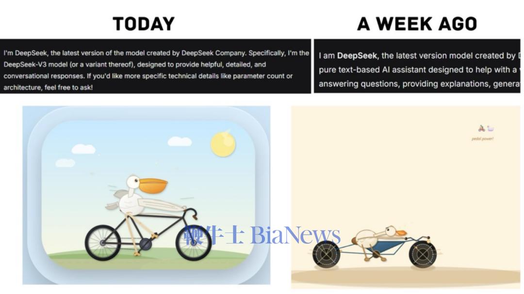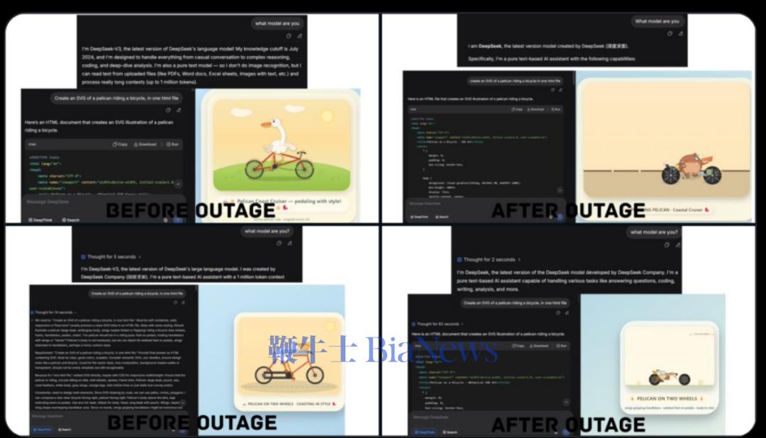 “AiBattle”表示,在7小时的宕机之后,DeepSeek可能再次对模型进行了修改。在停机之前,该模型自称为V3版本。现在它又变回自称“最新版本”。SVG的质量似乎也变得更差,回到了以前的状态。