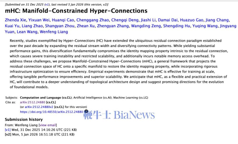 2025年12月31日,梁文锋上传发布了一篇名为《mHC: Manifold-Constrained Hyper-Connections》的论文。