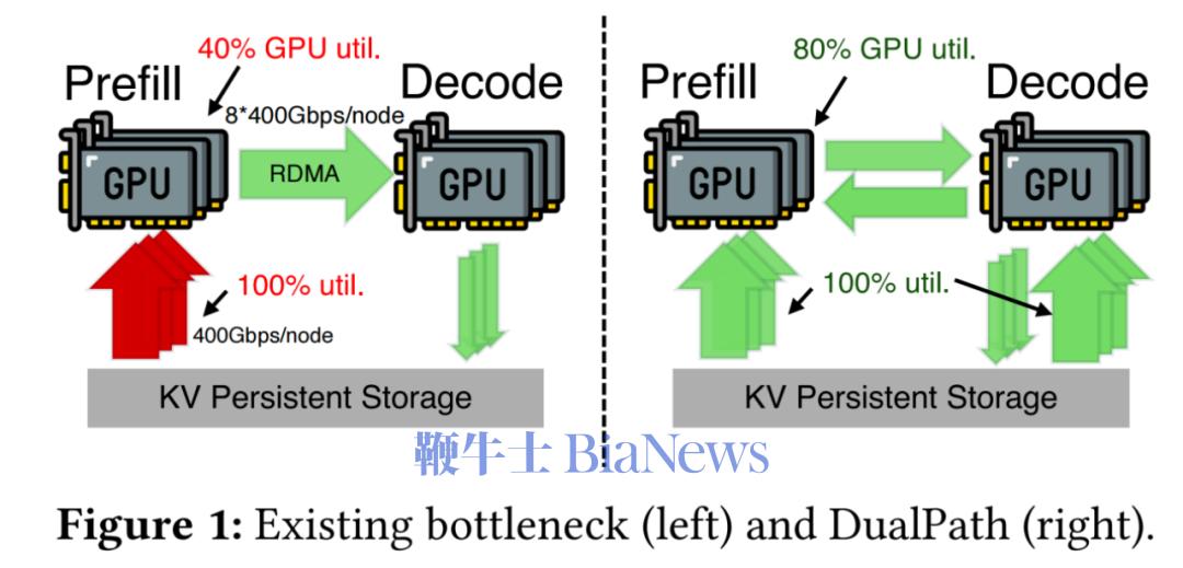 模型练好了,大脑也变聪明了,当它作为Agent去处理几十万字的长文本和多轮代码任务时,会产生海量的上下文缓存(KV-Cache)。这时候计算不再是瓶颈,“读取硬盘数据到显卡”的 I/O 带宽成了瓶颈。DualPath巧妙地调用了集群中原本闲置的解码节点(Decode)的网卡,去帮预填充节点(Prefill)搬运数据,让端到端的吞吐量暴增近2倍。