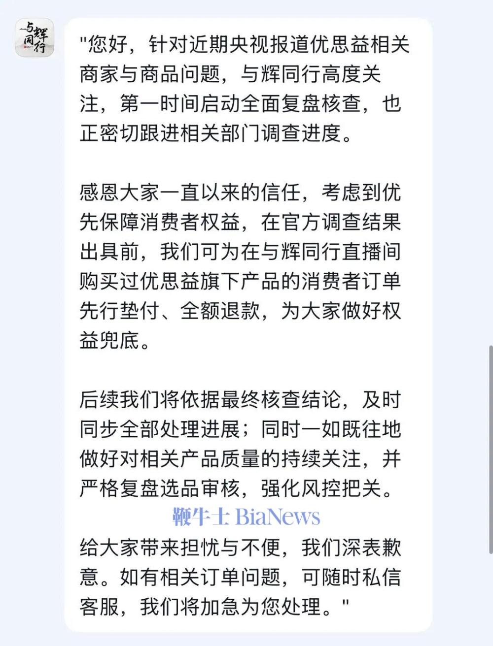 4月2日晚间,与辉同行终于通过客服给出了解决方案。蓓蓓向《财经天下》提供的截图显示,与辉同行方面表示,在官方调查结果出具之前,会为在直播间下单的消费者订单先行垫付、全额退款。后续,公司会严格复盘选品审核,强化风险把控。