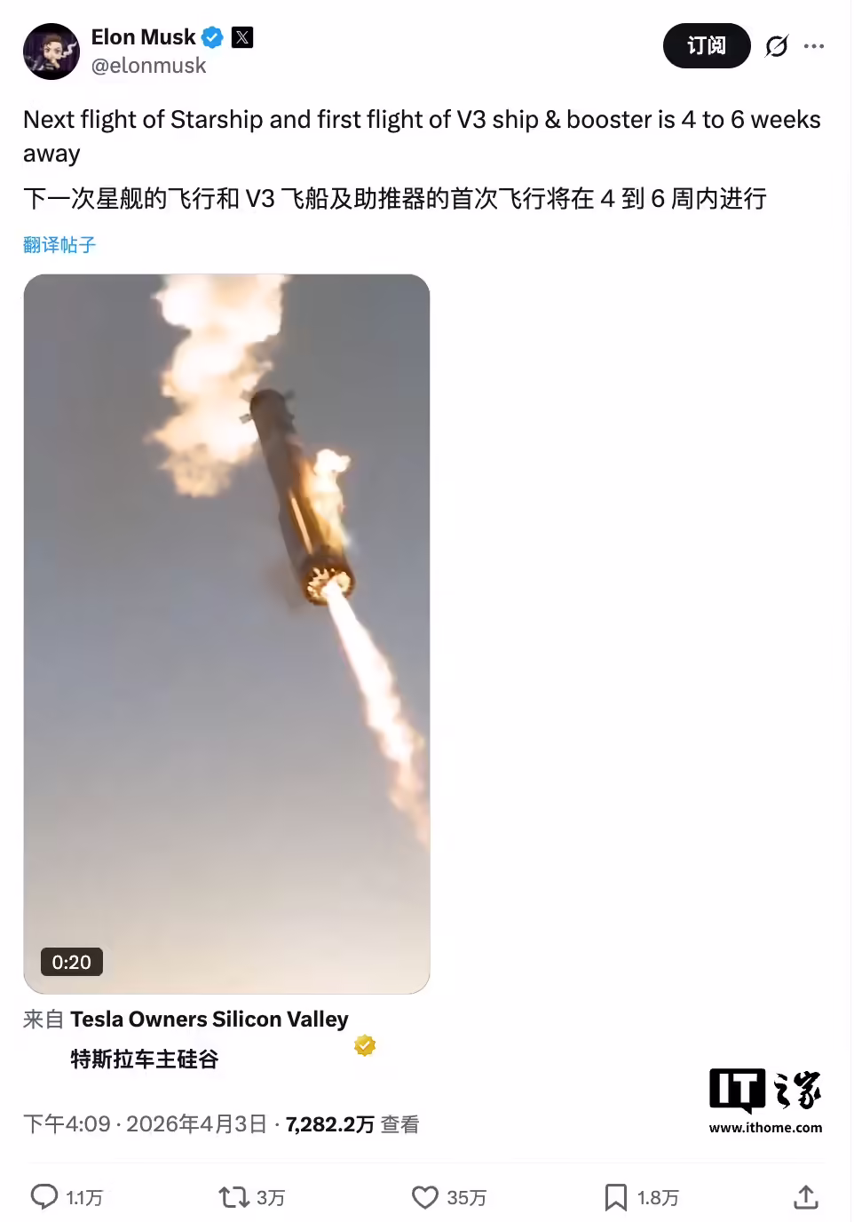 马斯克表示,V3 版本星舰及助推器距离下一次飞行还有 4 至 6 周时间。该型号原定 4 月首飞,目前已确认延后。