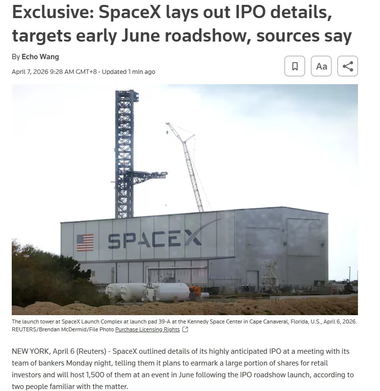 据路透社报道,消息人士表示,SpaceX计划于五月底公开其首次公开募股招股说明书。SpaceX计划于6月8日当周启动IPO路演。SpaceX计划在其IPO路演启动前一天,面向整个承销团的125位财务分析师举行线上会议。SpaceX IPO面向散户的配售规模将“非常庞大”,公司将在更接近交易实施时敲定最终的交易结构。