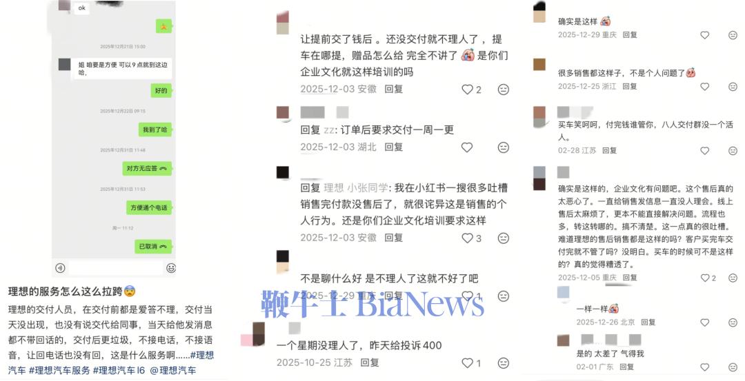 ( 部分理想汽车消费者在社交网络上,发布对销售体验不满的言论 )