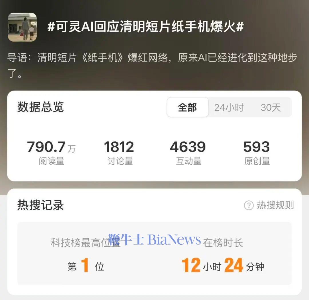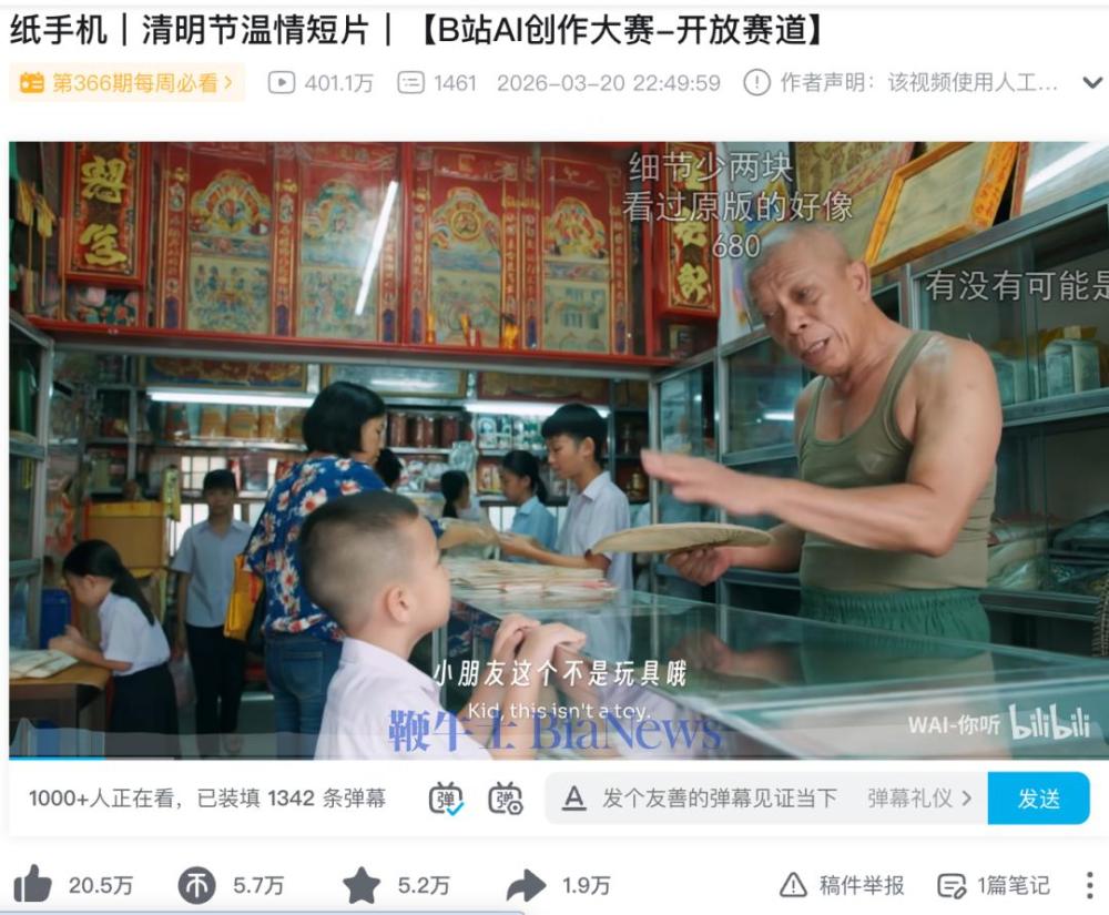 《纸手机》并不诞生于可灵为主导的创作项目,而是B站发起的AI创作大赛,发布时间也在清明节情绪还在酝酿的3月20日。