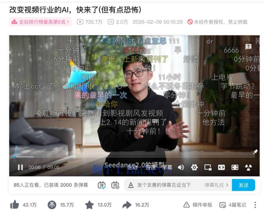 他在体验完Seedance2.0后坦言:“传统视频行业距离彻底被AI海啸冲走进入倒计时。”
