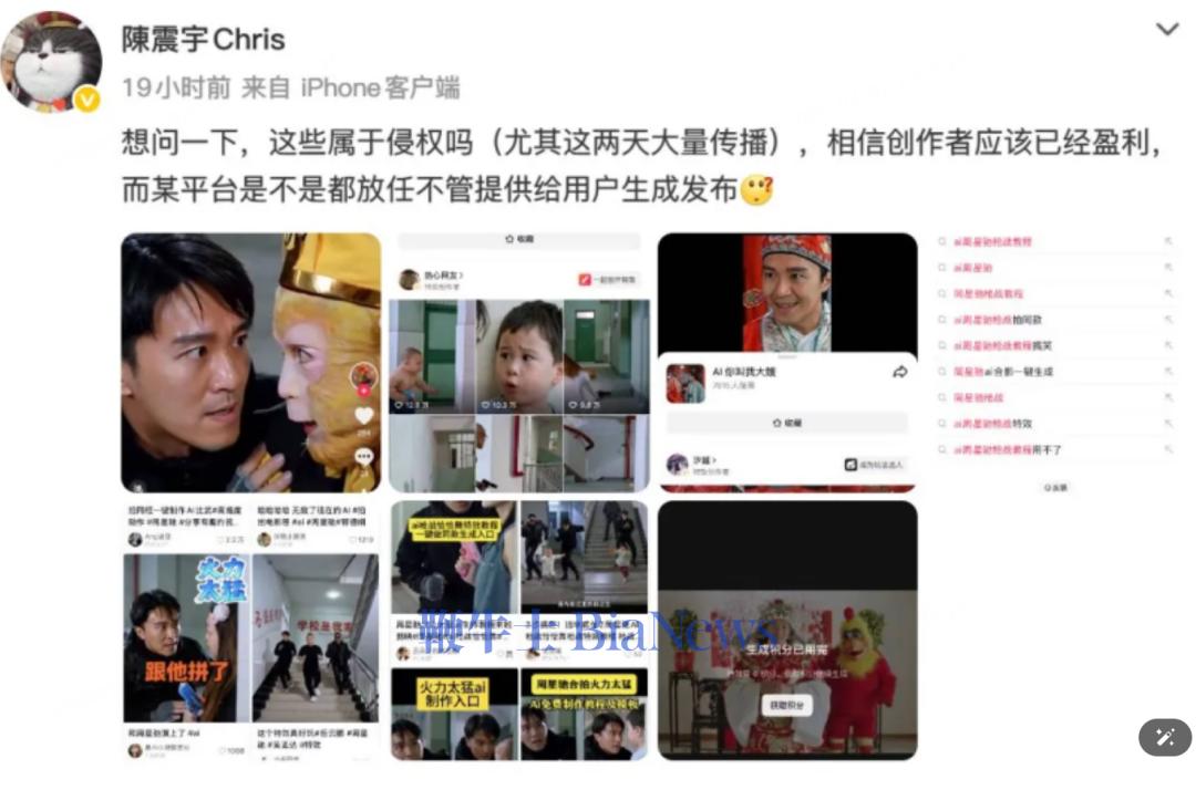 随后,大量自发的玩梗创作铺天盖地,尤其是围绕周星驰《大话西游》、《功夫》、《喜剧之王》等经典IP的角色重制成为短视频创作风头,直接引来了周星驰经纪人的炮轰。