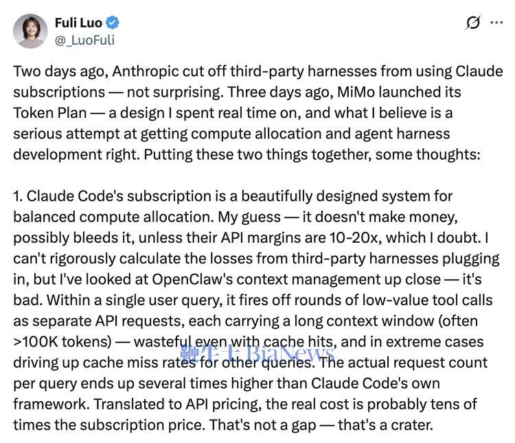 相比于错误理解成“封禁”并第一时间联想到“过河拆桥”的一堆讨论,小米 MiMo 大模型负责人罗福莉的一篇长文是少有的对这个事情真正认真分析,并聊到点子上的。