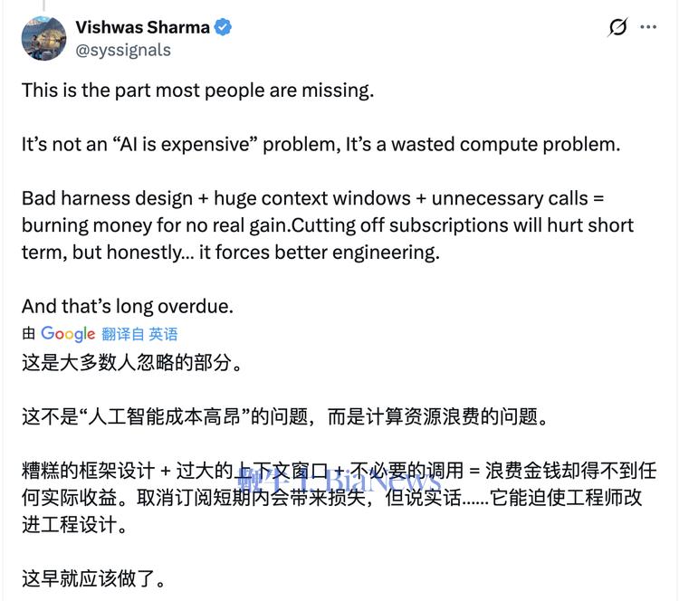 她写道:"第三方 harness 还是可以调用 Claude,只是不能再搭订阅的便车了。短期内,这批用户会感受到成本冲击,轻松跳升数十倍。但这个压力,恰恰会推动这些 harness 去改进上下文管理、最大化 prompt cache 命中率、减少无效 token 消耗。痛苦最终会转化为工程纪律。"