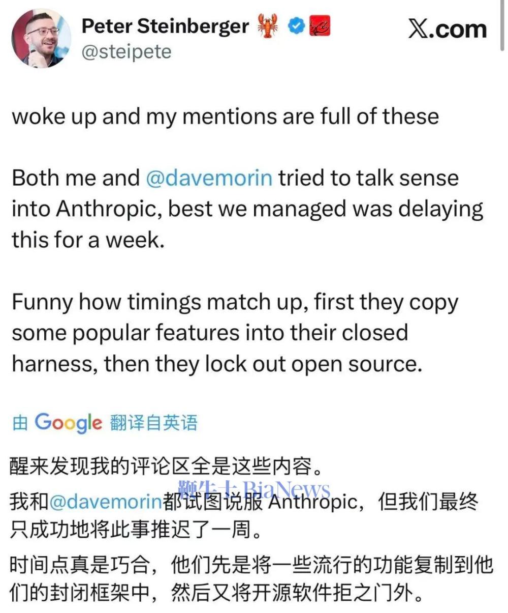 OpenClaw创始人Peter Steinberger在X上发帖暗讽:"时间点真巧,先把热门功能抄进自家封闭工具里,然后把开源锁在门外。"