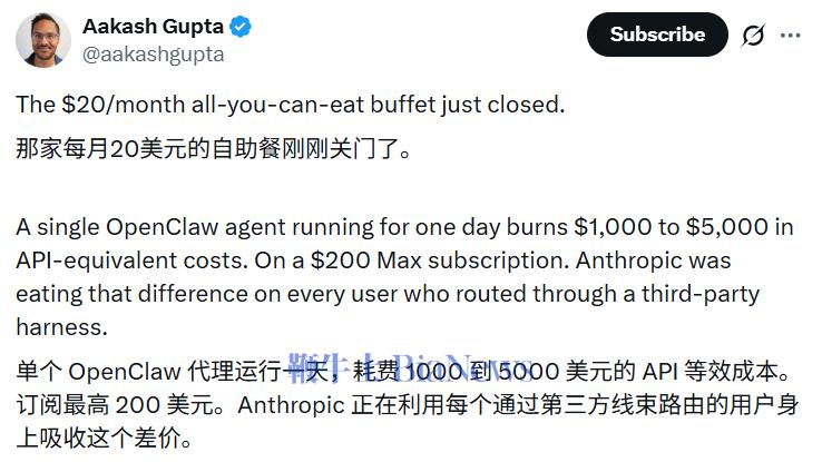 增长营销专家Aakash Gupta算了一笔账:一个OpenClaw Agent跑一天,API成本可能在1000到5000美元之间。而Claude Pro的月费是20美元,Max是100-200美元。Anthropic相当于在为每一个通过第三方接入的用户补贴数十倍的成本差额。