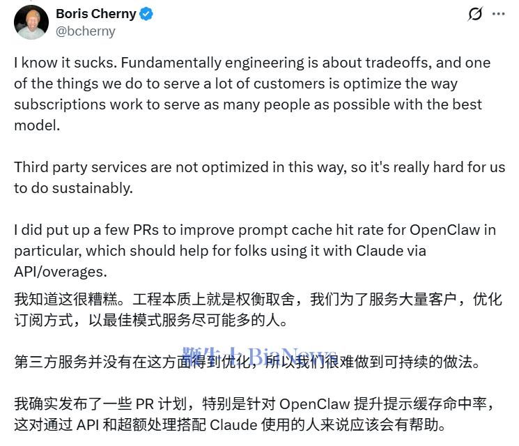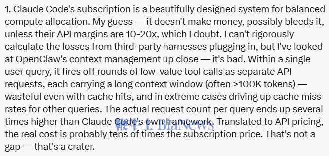 一位开发者在X上回复Cherny:"如果我把两个OpenClaw实例都切换到API或你推荐的Extra Usage,成本会高到不值得继续用。我可能不得不换到其他模型了。"