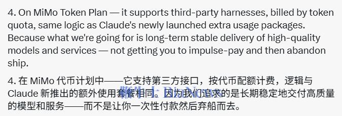 有意思的是,就在Anthropic宣布封杀的前三天,小米的MiMo刚刚推出了自己的Token Plan。这是一个按token配额计费的方案,明确支持第三方Agent工具接入。