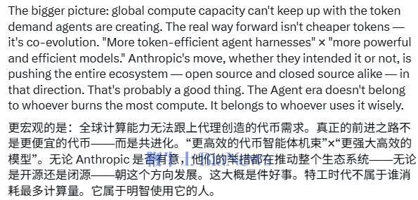 "Anthropic的这一步,不管他们是否有意为之,正在推动整个生态——开源和闭源——朝着这个方向走。这大概是一件好事。Agent时代不属于谁烧掉最多算力,而属于谁用得最聪明。"