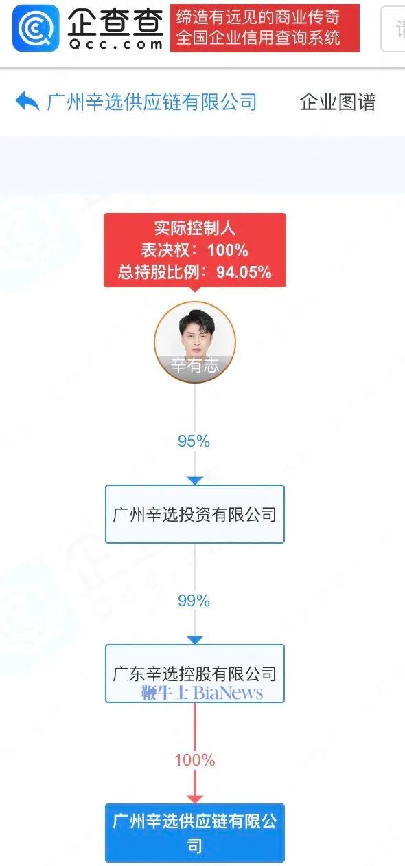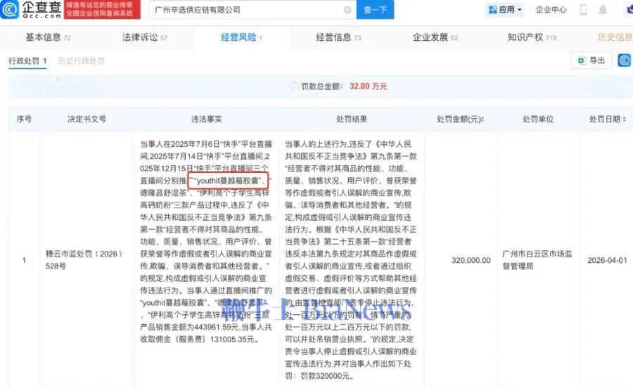 企查查显示,4月1日,广州辛选供应链有限公司因虚假宣传违法行为,被广州市白云区市场监督管理局罚款32万元。