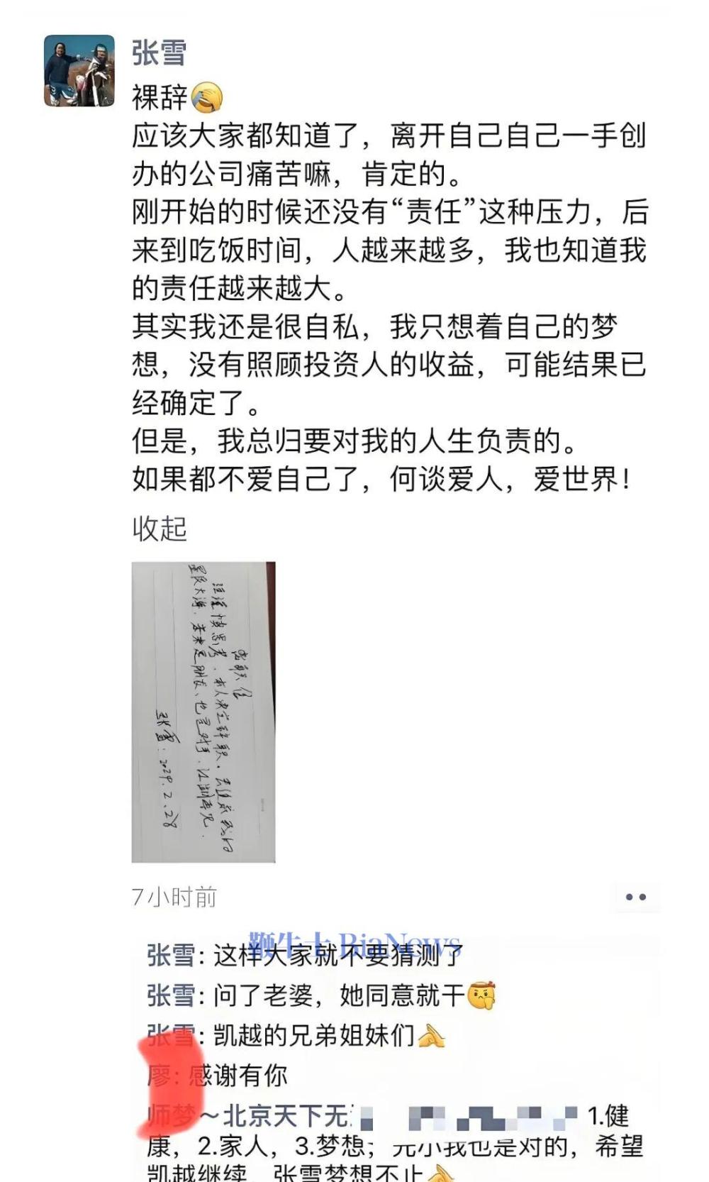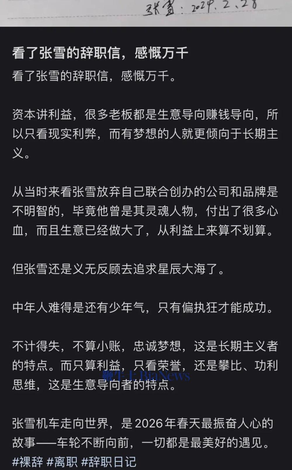 「但张雪还是义无反顾去追求星辰大海了。中年人难得是还有少年气,只有偏执狂才能成功。」「不计得失,不算小账,忠诚梦想,这是长期主义者的特点。而只算利益,只看荣誉,还是攀比、功利思维,这是生意导向者的特点。」在这份离职信之外,还有网友翻出了张雪当时的朋友圈!在朋友圈中,张雪表示自己裸辞了!应该大家都知道了,离开自己一手创办的公司痛苦嘛。肯定的!他还表示:我还是很自私,我只想着自己的梦想,没有照顾投资人的收益,可能结果已经确定了,但是,我总归要对我的人生负责的,如果不爱自己了,何谈爱人,爱世界。