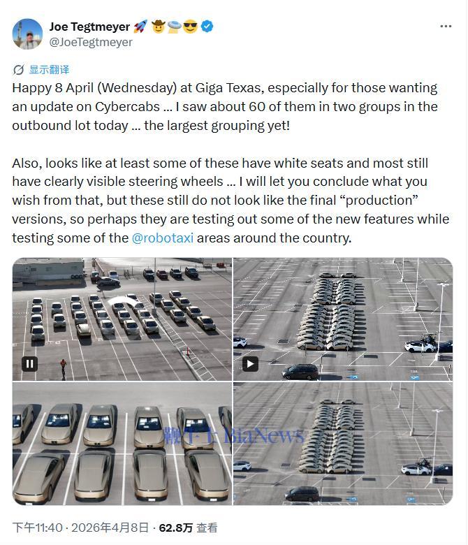 德州超级工厂观察者、无人机拍摄者乔・泰格迈尔在X平台发布动态,约60辆Cybercab分两列整齐停放在工厂出厂停车场,这是迄今该车型被观测到的最大规模集结。