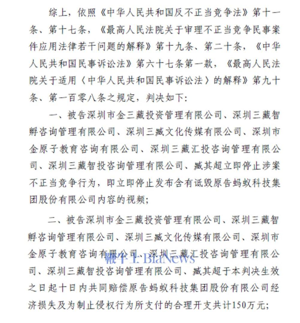 日前,浙江省高级人民法院就蚂蚁科技集团股份有限公司(以下简称“蚂蚁集团”)诉深圳市金三藏投资管理有限公司、臧其超等七被告商业诋毁及不正当竞争纠纷一案作出终审判决,依法驳回被告上诉,维持原判,认定七被告构成商业诋毁,判令其立即停止全部侵权行为,并连带赔偿蚂蚁集团经济损失及为制止侵权所支付的合理开支共计150万元。