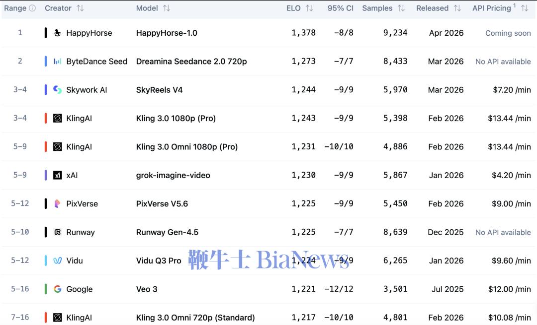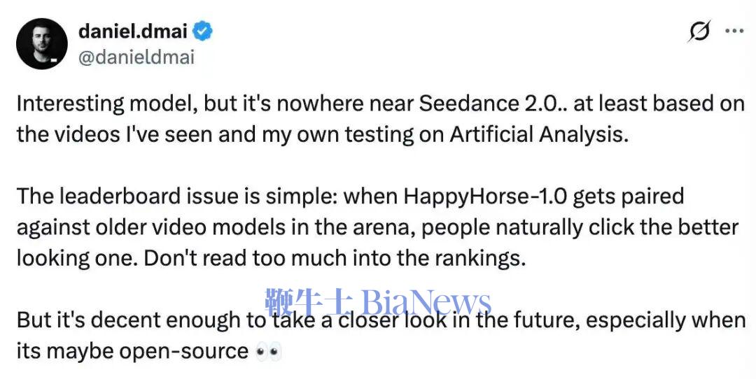 近日,Artificial Analysis的视频竞技场排行榜更新。一个从未出现过的名字——HappyHorse-1.0,同时出现在四个子榜单的前两位:截至4月9日中午,文生视频(无音频)赛道Elo1378分,领先第二名Seedance2.0整整105分;图生视频(无音频)赛道Elo1411分,刷新全平台历史最高纪录。在带音频的赛道上,它以1分和2分的微弱优势与Seedance 2.0并驾齐驱。没有发布会,没有任何公司背书,这匹黑马在短时间内完成了从零到双榜第一的跨越,将此前稳坐榜首数月的字节跳动Seedance2.0拉下了王座。在它的模型名称旁边,只有四个字:“即将推出”。这匹马,还没有真正跑起来。这匹“快乐马”究竟是什么来头?它的第一有多少含金量?更重要的是,它会对行业带来什么?要理解HappyHorse的真实水平,需先拆解它在Artificial Analysis(以下简称“AA”)不同榜单上的得分情况。AA视频竞技场设四大核心赛道:文生视频(无音频)、图生视频(无音频)、文生视频(带音频)、图生视频(带音频)。截至4月9日的最新数据,在纯画质维度,HappyHorse已经建立统治地位;但一旦进入音画融合,它的领先优势并没有那么明显。在文生视频(无声)赛道,HappyHorse斩获1378分,领先第二名字节跳动Seedance2.0 105 分。在Elo体系中,超过百分的差距意味着用户在盲测中几乎呈现“一边倒”的偏好。而在图生视频(无声)赛道,它跑出的1411分更是刷新了平台历史记录。对于追求极致运镜与画面质感的创作者而言,这匹马目前就是行业天花板。然而,一旦加入音频维度,战局瞬间反转。HappyHorse与Seedance2.0的分差收缩至1-2分,几乎可以忽略不计。这也说明,在音画同步、音频质量及语义对齐层面,HappyHorse并未实现大幅超越,双方仍处于同一技术水平线。结合社交媒体上的技术拆解与用户反馈,HappyHorse的优势大致可以归结为两个方向。其一是架构层面的统一建模路径:多个信源指出,它采用约150亿参数规模的纯自注意力单流Transformer,将文本、视频与音频token放入同一序列进行联合建模,这种方式区别于常见的“视频生成+音频后处理”的拼接方案,使声音与画面在生成之初就处于同一语义空间,从而在口播与人物场景中呈现出更自然的同步效果。其二是对人像场景的针对性优化:根据公开信息,多位参与AA盲测的用户反馈,其人物面部纹理更加细腻、镜头切换更为流畅,在复杂提示词下的人物一致性表现也更稳定,一位用户在连续对比Pyramid-Flow、Veo 3.1 Lite与PixVerse V6后甚至表示“只要出现HappyHorse基本都会选它”。而这一主观体验恰好与Elo高分形成呼应。在AA的评测样本中,人像与口播类内容占比超过60%,使得这一局部优势被持续放大,并最终体现在整体排名上。但高分并不意味着全能,社交媒体上的批评声同样不少。不少用户指出,已经发布的视频中水体抖动细节不自然、快速运动中的条纹物体崩坏以及在大屏显示下的画质劣化等问题。这些缺陷在无音频赛道的高分掩盖下往往被忽略,但在影视级应用中却是致命伤。一位AIGC导演告诉「AIX财经」,从流出的片段看,它的感官很接近Seedance2.0,真实度不错,但剧烈运动时的“AI感”依然浓重。X用户daniel.dmai更是直言不讳:“别把排名太当回事。当HappyHorse碰到的都是些旧模型时,大家自然会选那个看起来更顺眼的。它跟 Seedance2.0比还差得远。”在AA评测中,用户先提交提示词或参考图像,系统调用两个模型生成结果并进行匿名展示,用户在不知模型来源的情况下进行选择,所有投票被纳入类似国际象棋排名的Elo系统,根据胜负关系动态调整分数,从而得到最终排名。作为AI视频领域最具公信力的评测体系之一,Artificial Analysis的权威性正是来自于这套能够捕捉用户真实偏好的游戏规则。HappyHorse的高分是超过9000次真实用户盲选结果,比任何实验室跑出来的技术指标都更接近真实用户感受。但其局限同样明显。首先,样本分布并非均衡,人像与口播类内容占比过高,使得在该场景中表现突出的模型更容易获得高分。另外,“刷榜”风险同样存在。有研究指出,Elo评分系统在特定情况下,可能通过数学变换掩盖底层数据的不确定性,从而影响评分。因此,榜单高分不等于实际应用中的完美表现。在实际项目中,高分辨率下细节的稳定性、长时间视频的连贯性等,都是榜单盲测难以覆盖的。更需要强调的是,目前除了官方榜单与有限的外部样本外,HappyHorse尚未经过充分的第三方使用与验证。这匹“匿名快马”的真实速度与能力,需等模型真正披露后才会揭晓。随着HappyHorse霸榜,寻找这匹马的“主人”成了本周AI圈最热闹的猜谜游戏。有开发者将HappyHorse在榜单中的公开基准表现,与已知模型逐项对比,试图通过“能力特征”反推其来源。X用户Vigo Zhao的比对结果指向一个高度重合的对象——daVinci-MagiHuman。视觉质量4.80、文本对齐4.18、物理一致性4.52、语音字错率14.60%,四项核心指标几乎一一对应。与此同时,两者在官网架构描述、演示视频风格上的相似性,也让这一猜测进一步增强。公开信息显示,daVinci-MagiHuman由上海创智学院(SII)生成式人工智能研究实验室(GAIR)与AI初创公司Sand.ai联合研发,已于今年3月在GitHub开源。如果这一链条成立,那么HappyHorse并非“横空出世”,而是一次技术复用。相比于技术比对,第二条线索更具戏剧性,它指向了一个名字——张迪。多个信源将HappyHorse与张迪联系在一起。公开信息显示,张迪在2010年毕业于上海交大后加入