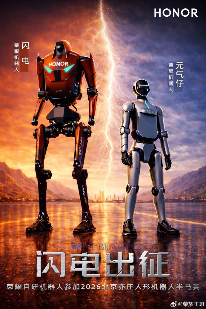 同时,荣耀全球首席营销官关海涛转载央视新闻视频宣布,荣耀机器人“闪电”“元气仔”正式出征4月19日北京亦庄马拉松比赛,成为全球首个终端大厂派出选手的机器人马拉松挑战者。