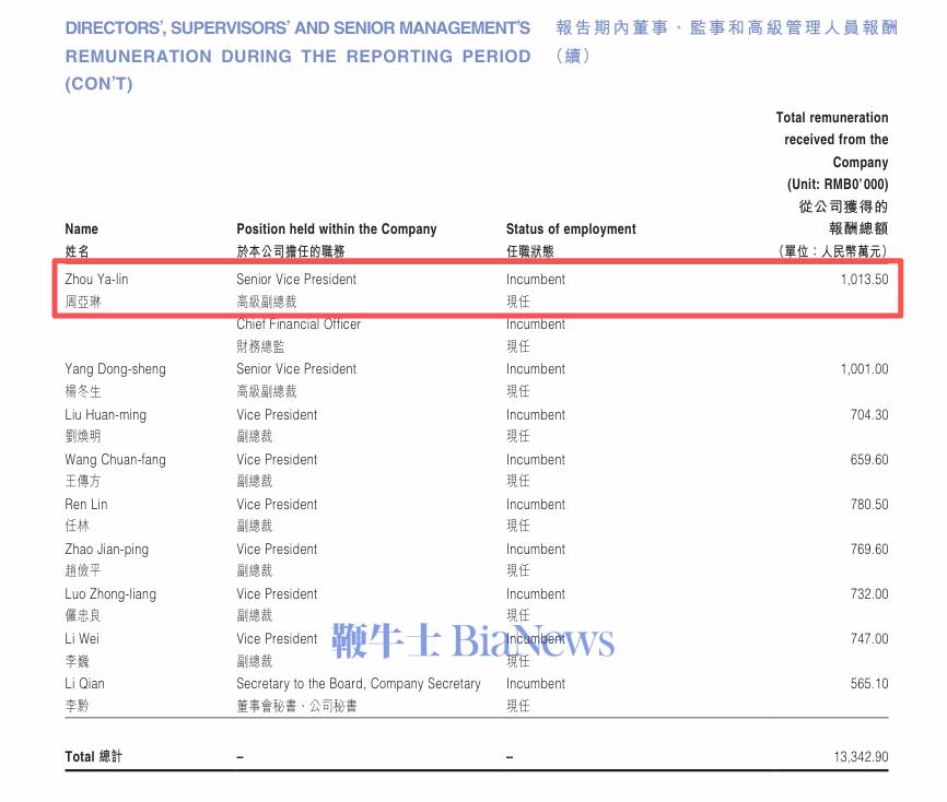 据年报数据显示,周亚琳2025年的税前年薪为1013.5万元,较2024年的896万元增加了117.5万元,并成功突破千万元大关。