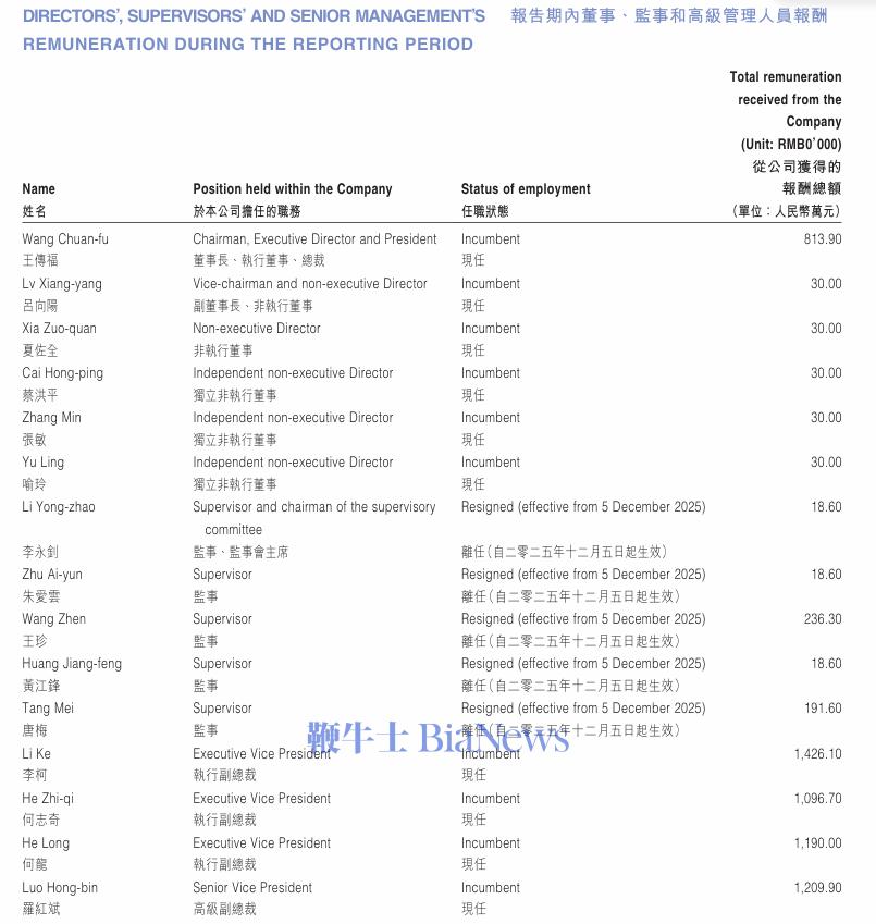 年报显示,执行副总裁李柯以1426.1万元年薪居首,何志奇、何龙、罗红斌、杨冬生等高管薪酬同样超过千万元。
