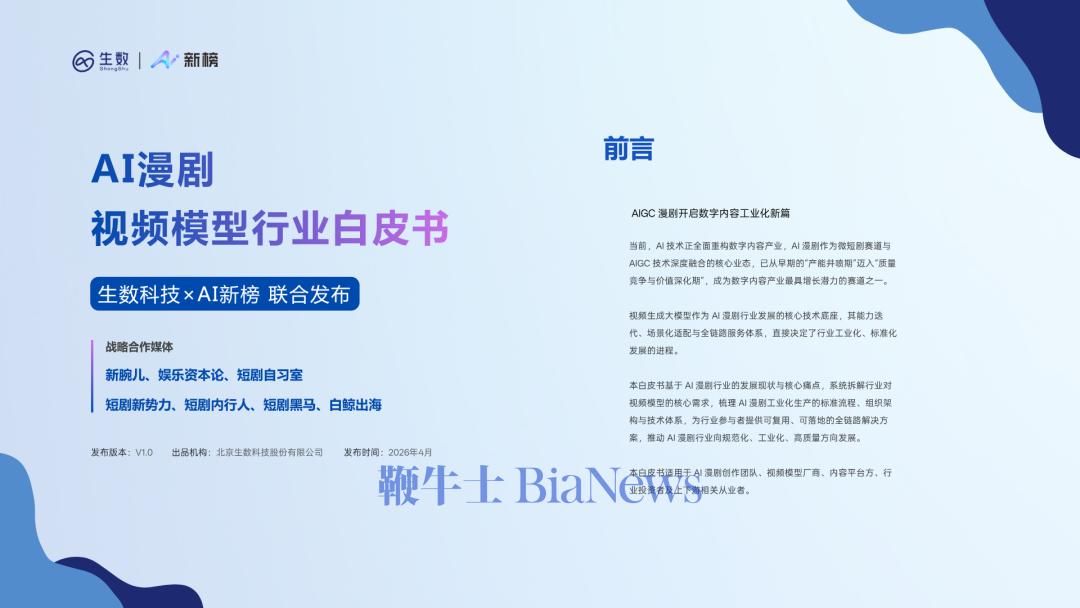 对于行业而言,这份白皮书的发布标志着AI漫剧从野蛮生长进入了标准化、工业化的新阶段。生数科技联合AI新榜梳理了行业发展规律、拆解了核心痛点、输出了可落地的生产模式与组织转型方案,为全行业参与者提供了清晰的实践参考。