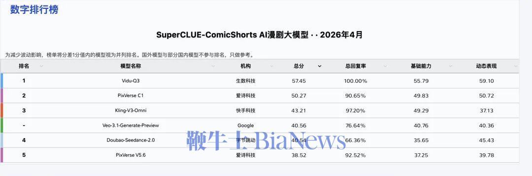 在一项专为漫剧生成场景下的专项评测权威榜单SuperCLUE-ComicShorts发布的最新AI评测榜单中,Vidu Q3以高分位居榜首