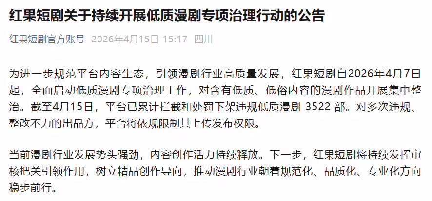 4月15日,红果短剧发布关于开展低质漫剧专项治理行动公告。