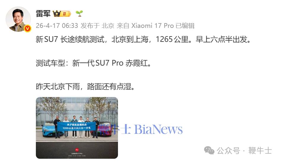 雷军昨日表示,“去年年初我曾说过,开YU7标准版,充满电,从北京到上海,1300公里高速,中间只充了一次电,我非常震惊。这段话引起了网友们关注。这次新SU7,我打算直播给大家看。”