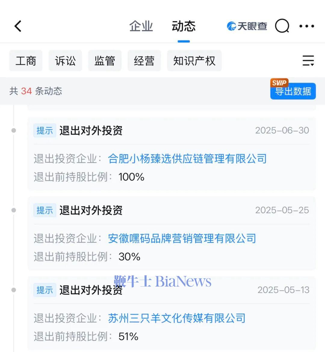 天眼查显示,三只羊控股在2025年5、6月份接连退出了“苏州三只羊文化”、“安徽嘿码品牌营销”、“合肥小杨臻选供应链”等公司。