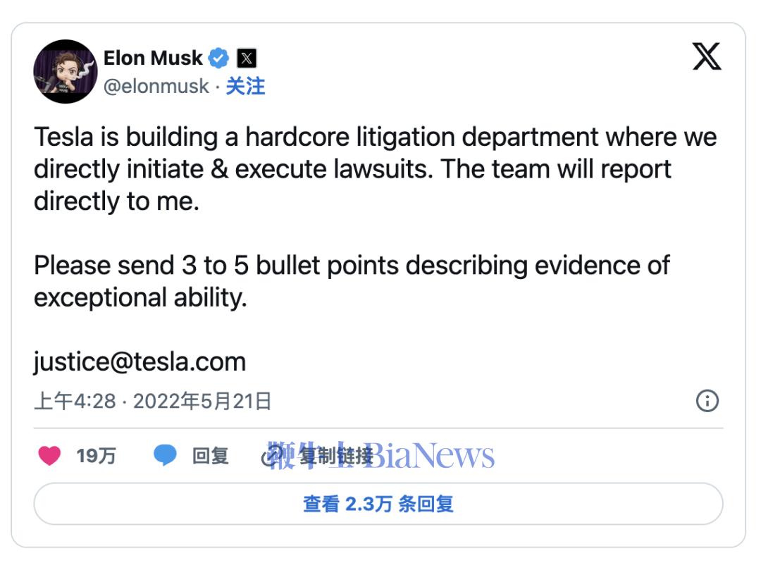 2022年5月,埃隆·马斯克(Elon Musk)意气风发地宣布特斯拉正在组建一个“核心诉讼部门”,誓言要“直接发起和执行诉讼”。他将其形容为一支由“街头斗士”组成的铁血团队。