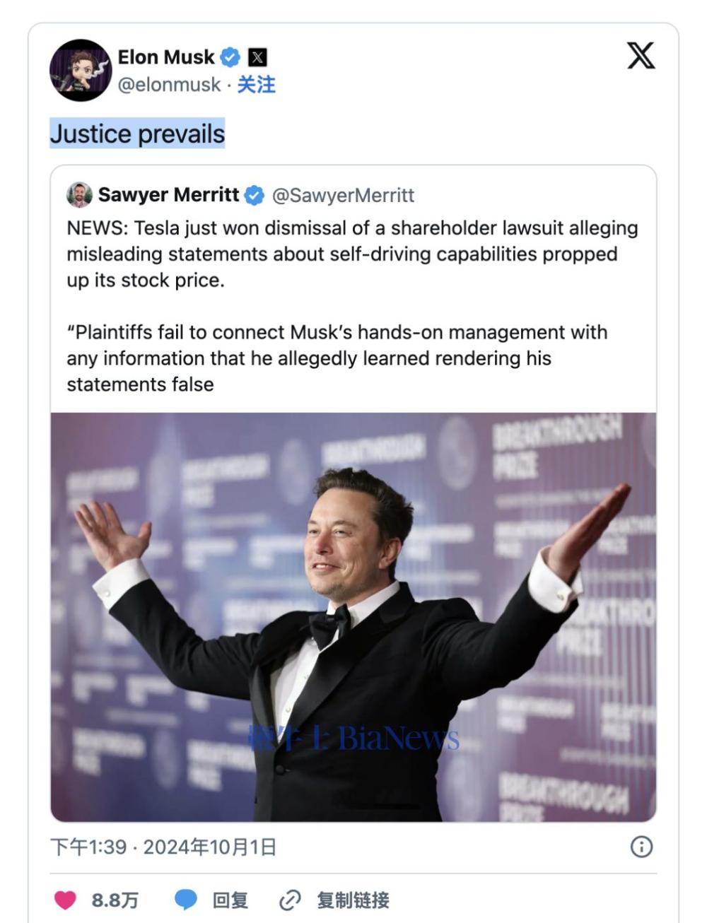 马斯克还在其铁杆粉丝索耶·梅里特(Sawyer Merritt)的相关动态下评论道:“正义终将战胜邪恶。”