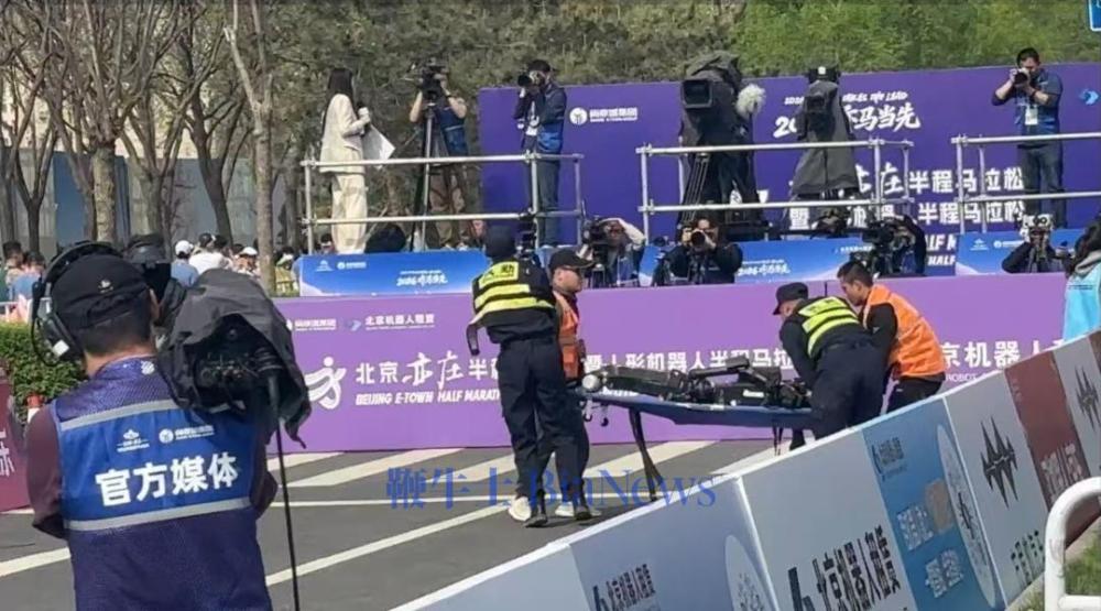 宇树H1机器人半马赛场终点「累倒」,现场工作人员紧急用担架将其抬离赛道