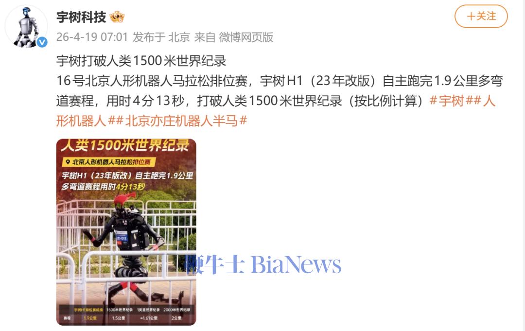 同日稍早前,宇树科技发布消息称,16号北京人形机器人马拉松排位赛,宇树H1(2023年改版)自主跑完1.9公里多弯道赛程,用时4分13秒,打破人类1500米世界纪录(按比例计算)。