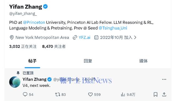 4月19日下午消息,普林斯顿人工智能实验室研究院Yifan Zhang今日于X发布了一条“V4 下周”的隐晦内容,此举引发市场对于DeepSeek V4大模型发布的推测,被认为是DeepSeek提前发布预热,同时印证了DeepSeek V4将于4月下旬发布的消息。
