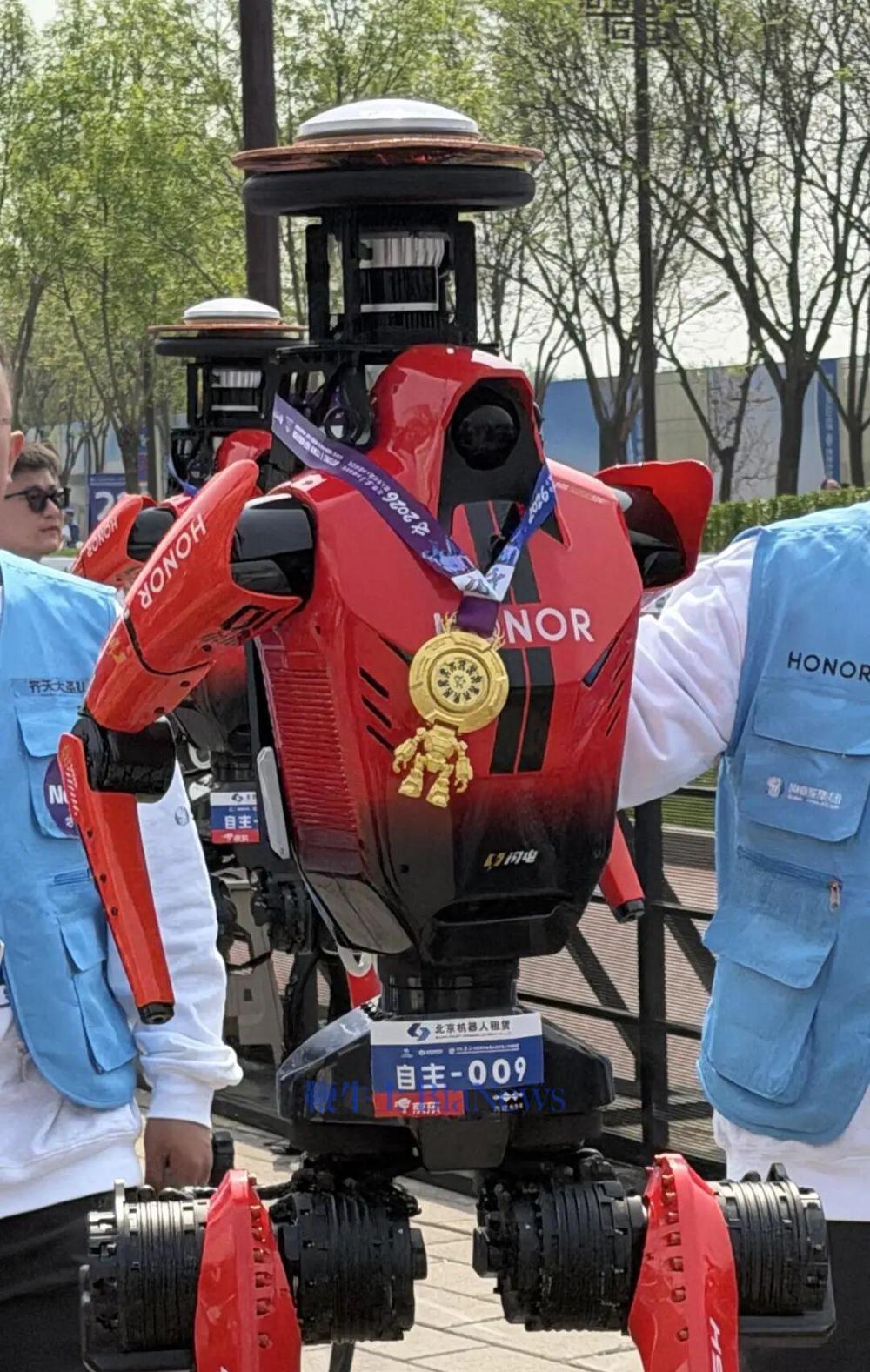 4月19日7时30分,2026北京亦庄半程马拉松暨人形机器人半程马拉松在北京经济技术开发区鸣枪开跑。超百支人形机器人赛队和1.2万名人类跑者共同出发,挑战全长21.0975公里的赛道。财联社记者在赛事现场看到,人形机器人从起点依次单发起跑,两台之间间隔30秒。面对一台又一台飞奔的人形机器人,不少观众都在路边惊呼“跑得真快!”最终,齐天大圣队参赛机器人“闪电”以50分26秒(净用时)夺冠,成绩超过人类半程马拉松世界纪录57分20秒。紧随其后的雷霆闪电队、星火燎原队分别以50分56秒、53分01秒获得亚军和季军。前三支队伍的参赛机器人均来自荣耀“闪电”,均采用自主导航方式完赛。一年前,首届亦庄人形机器人半马冠军天工Ultra用时2小时40分42秒,参赛队伍只有20支左右、完赛6支。短短一年时间,头部队伍的完赛时间整体已经压缩到1小时以内,参赛规模扩容近5倍。“过去各家的能力更多是在各自设定的场景中展示,今年参赛机器人数量增长近15倍,参赛队伍数量增长近5倍,大家在相对统一的规则、更接近真实世界的环境下进行集中检验,使赛事成为了一个具有高可比性的‘行业测试场’,也推动了行业加速集中检验与技术竞争。”李威博士说。根据赛事主办方披露的数据,本届赛事共有百余支机器人队伍参赛,包括5支国际赛队,参赛主体包括北京人形机器人创新中心、荣耀、宇树、松延动力等企业,以及清华、北大、中国科大等高校和科研院所,其中自主导航机器人占比近四成。财联社记者在赛事现场看到,不同厂商的机器人外观差异很大,有身高接近成年人的全尺寸机器人,也有身高一米出头的小型机型;有的迈步幅度较大,有的以高频小步前进。未参赛的机器人在现场承担配速、补给、摄影等岗位,北京交警机器人首次在赛道上指挥选手。高工机器人产业研究所所长蔡炳贞告诉财联社记者,机器人马拉松比拼的是全身运控能力,产品中长时间的稳定性以及环境适应力。另外,适配跑步场景的产品设计能力也越发重要,比如如何减轻重量、去除不必要的零部件、增强腿部爆发力等。夺冠的荣耀“闪电”身高169cm,有效腿长0.95米,外观采用机甲风设计。荣耀方面告诉财联社记者,“闪电”的散热、动力和控制三方面均为自研。散热方面,“闪电”搭载荣耀自研液冷散热系统,高功率液泵每分钟换热流量超过4升,用于解决高负荷运动状态下的散热问题;动力方面,机器人采用荣耀自研一体化关节模组,峰值扭矩可达400牛·米;控制方面,“闪电”依托荣耀自研的高动态运控算法和多传感器融合技术。“闪电”在百米跑中的峰值速度约为6米/秒。荣耀另一款参赛机器人“元气仔”身高136.9cm,采用银色亲和化设计,以遥控及自主两种方式参赛并同步完赛。荣耀的消费电子基因是其人形机器人业务发展势头良好不可忽视的原因。“从散热技术与材料到轻量化设计,再到硬件的可靠性,这些在移动终端上的技术为机器人综合能力的快速提升提供了强有力的支撑。”荣耀方面告诉财联社记者。从供应商上来看,荣耀机器人环节的供应商也与传统消费电子业务供应商高度重合。领益智造(002600.SZ)方面告诉财联社记者,该公司是荣耀本次夺冠机器人全套结构件和表面处理的核心供应商,目前已批量交付产品。“支撑荣耀‘闪电’机器人(包揽前六名)完成半程马拉松21公里极限赛程的159款核心金属结构件出自领益智造横沥工厂,覆盖髋部,腿部,脚部,躯干等关键运动单元,荣耀‘闪电’机器人打破人类半程马拉松世界纪录,且全程零故障,零失效。”领益智造方面向财联社记者表示。蓝思科技(300433.SZ)赛后在其官方公众号发文称,荣耀机器人的132款核心金属结构件由蓝思科技打造,覆盖头部、手臂、髋部、腿部等关键运动单元。瑞声科技(02018.HK)在其官方公众号发文表示,“闪电”集成了“高性能高爆发稳定”的本体,公司正是这一稳健本体背后的核心支撑者;同时,公司为“元气仔”头部、腿部核心运动单元的关键结构件提供支持。此外,有接近兆威机电(003021.SZ)人士向财联社记者透露,兆威机电也参与荣耀机器人的供货;禾赛科技曾表示,荣耀首款人形机器人搭载了禾赛JT系列激光雷达;奥比中光此前官宣,荣耀首款人形机器人搭载奥比中光Gemini 330系列双目3D相机。北京市经信局装备处副处长梁洪郡在赛事现场接受财联社在内的媒体采访时表示,从本次人形机器人参与半马的表现来看,人形机器人这一年来的技术进步主要体现在机器人关键零部件的提升,包括关节、电池、电机、硬件结构等多方面。以荣耀的“闪电”为例,梁洪郡表示,“闪电”的电机输出扭矩最大达到600Nm,而去年最高的是420Nm左右;续航方面,“闪电”在本场赛事中仅更换过一次电池,单块电池续航可突破10公里,远高于去年参赛者单块电池4-5公里续航的水平。智元创始人、董事长兼CEO邓泰华在4月17日举办的APC2026合作伙伴大会上表示,2026年是具身智能从开发态进入部署态的元年。邓泰华在演讲中发布了七大部署态解决方案,涵盖产线上下料、拆码垛、物流分拣、导览导购、零售服务站、安防巡检和工商业清洁。邓泰华还提到,智元今年的目标是实现数万台的量产,收入的30%会来自海外。落地场景方面,半山创投董事长戴福全向财联社记者表示,人形机器人当前最能放量的场景是工业制造和仓储物流。戴福全提到,工业