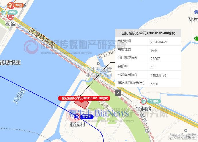 世纪城核心单元XS010101-08地块,四至:东至亚运村路、南至纬二路、西至观澜路、北至纬一路。地块西面距离钱塘江约160米,南面距地铁亚运村站、亚奥万象天地约150米,东面紧邻宁巢美地公寓五期人才共有产权保障住房。