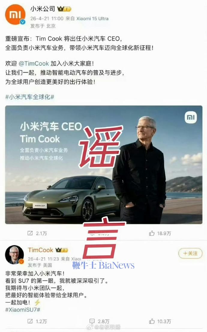 4月22日,话题词“以为库克真加入小米汽车了“冲上热搜第一,有网友P图玩梗称Tim Cook将出任小米汽车CEO。